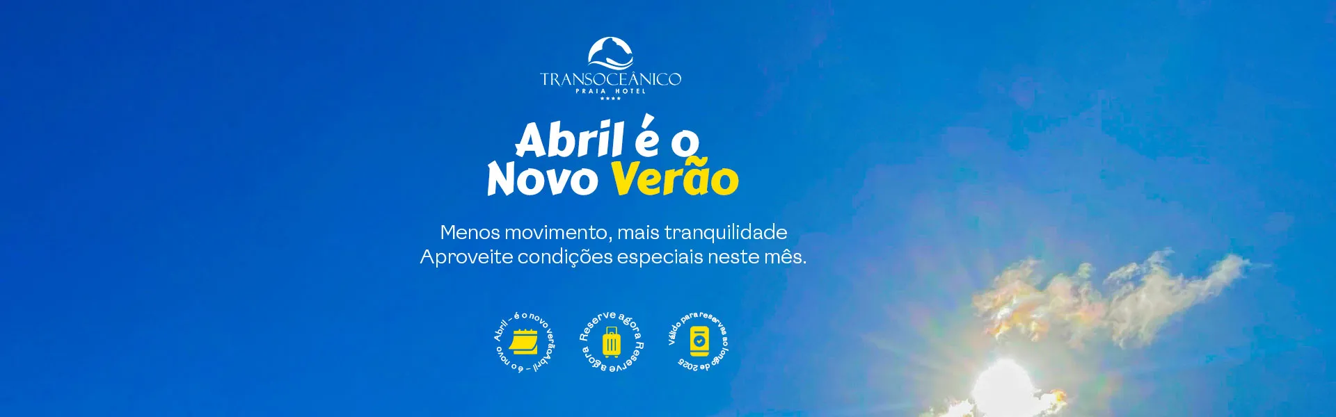 No Transoceânico Praia Hotel, em Porto Seguro, abril é o novo verão: a mesma energia solar, mas com muito mais tranquilidade e menos movimento para você relaxar de verdade. Aproveite nossas condições especiais para este mês e curta o paraíso a poucos passos da praia, com café da manhã completo, estacionamento incluso e o conforto que só quem planeja o descanso perfeito merece encontrar.